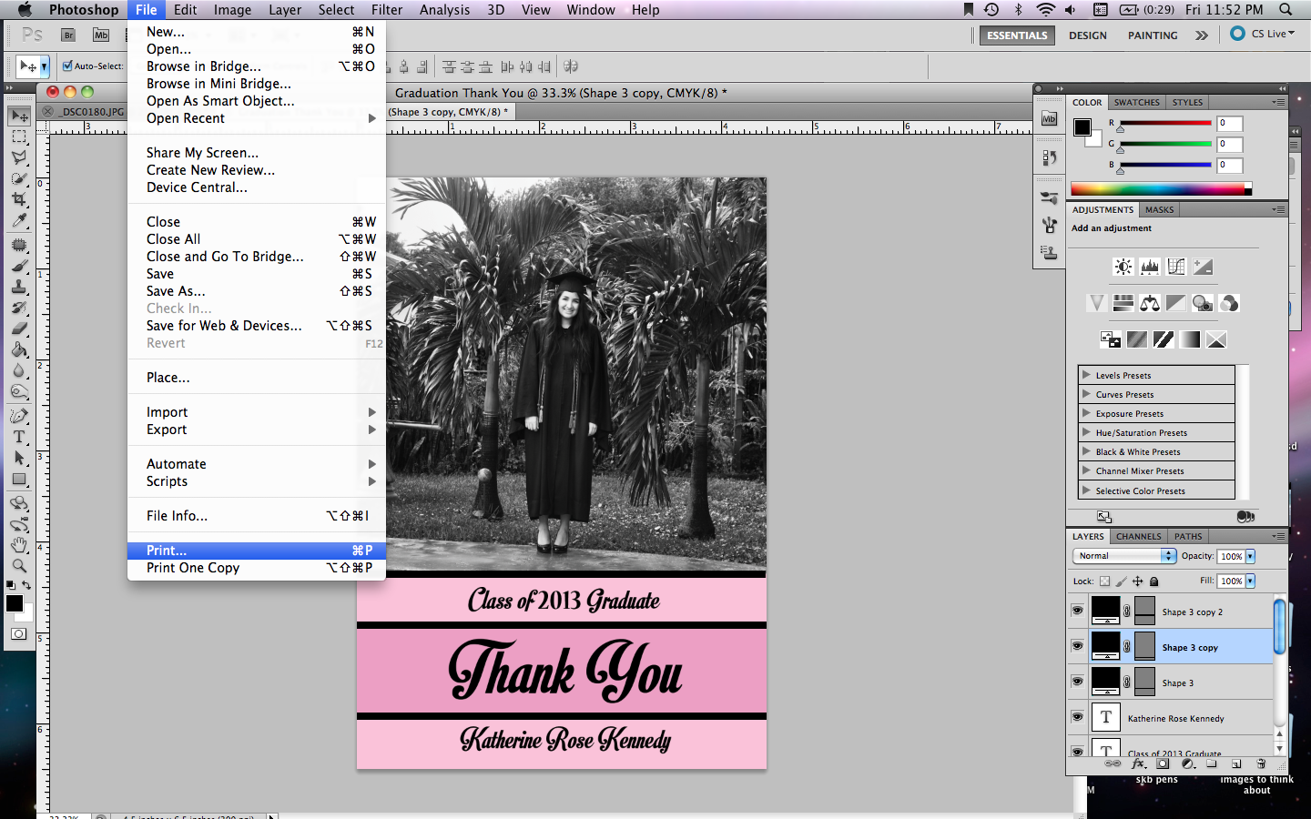 Now using the rectangular shape tool again create a thin rectangular bar that separates the "Thank You" text and the "class of _____ graduate" text. I choose black to correlate with the black and white image above but you could use any color.